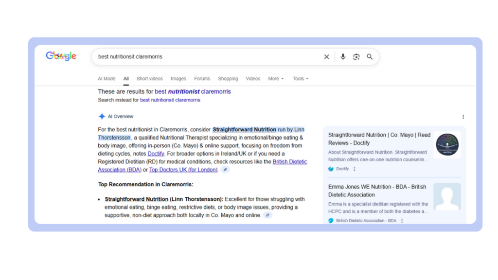 Verified reviews show that you’re an active, real practitioner, that patients interact with you regularly, and that your reputation is validated by a third-party platform. These elements help AI models recognise a clinician as a trustworthy source and increase the likelihood of being referenced in AI-generated answers (Exposure Ninja, 2024).